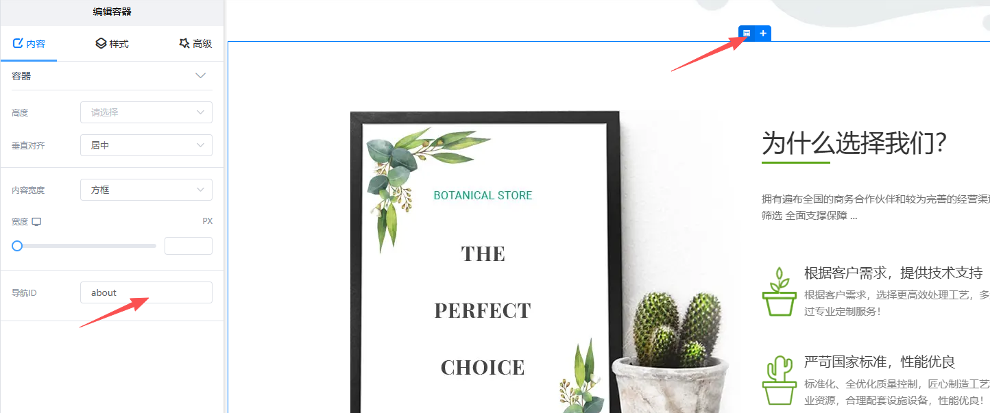 1. 先找到需要跳转到的内容所在容器,点击编辑容器,设置对应的锚点id